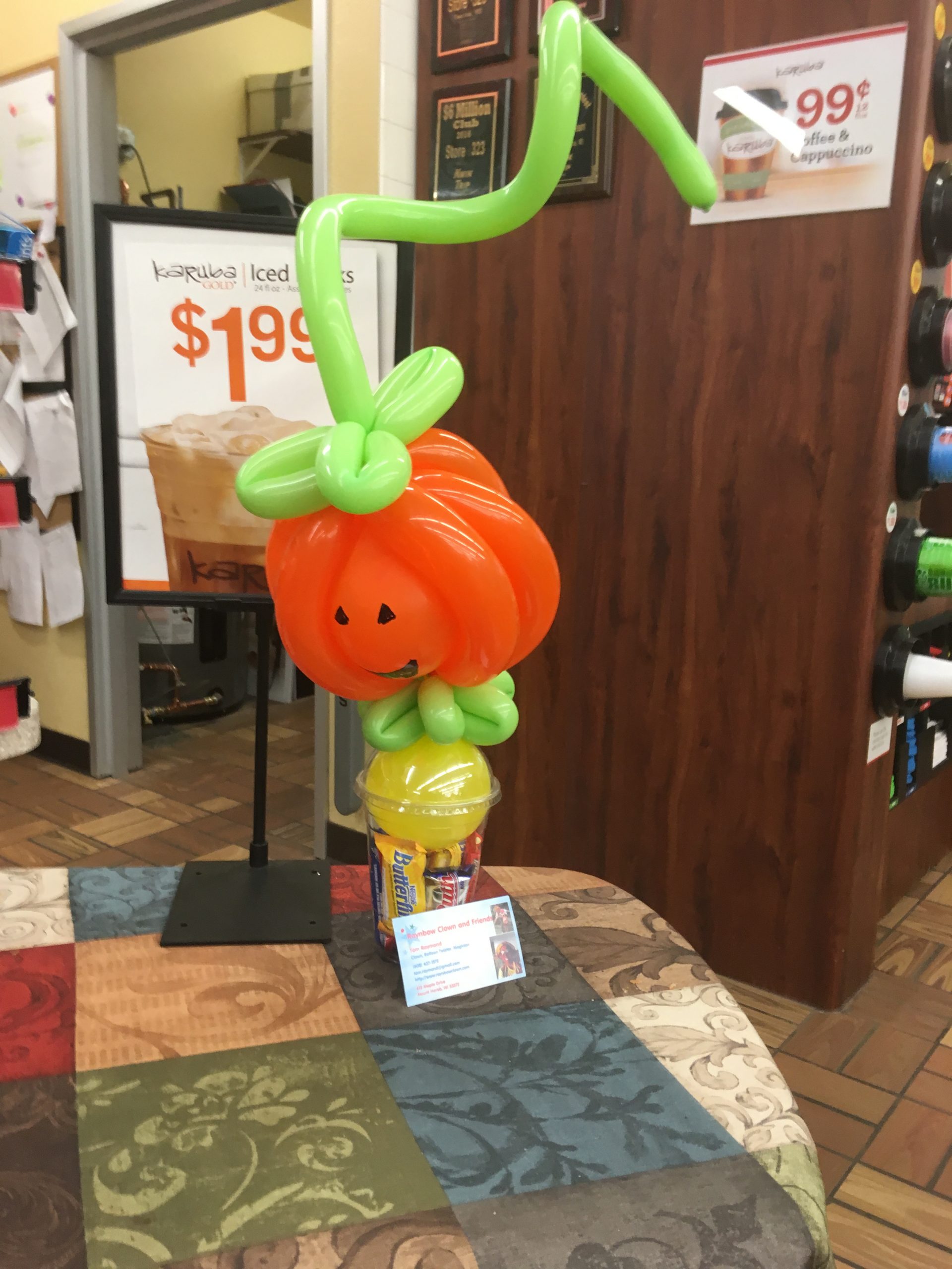 I dropped off a Pumpkin Candy Cup at the Kwik Trip on Mineral Point Road this morning – and the kind people there were nice enough to feature him on his own table.