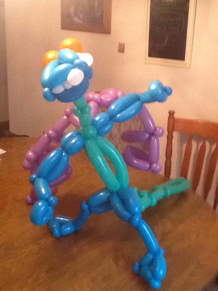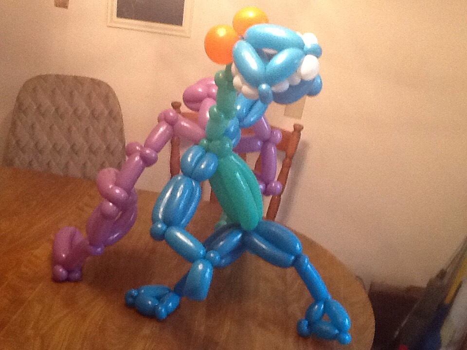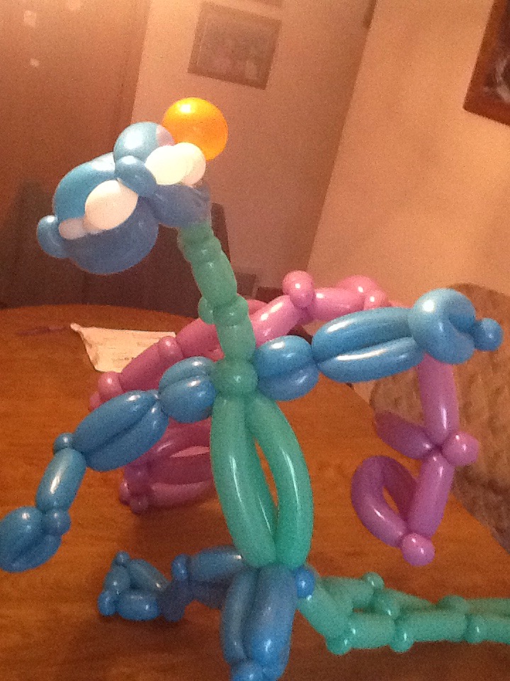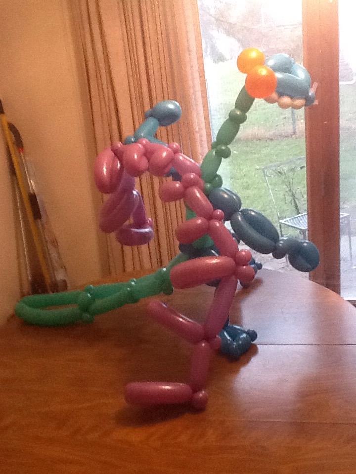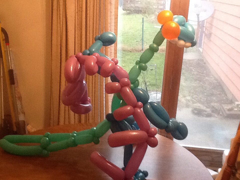 A friend asked me to make a balloon dragon as a prize in a Trivia contest that she’s a part of — so here’s my second attempt. I showed her the first attempt a week ago so she could do photos, post on Facebook, etc. But to be sure that he’s not deflated, here’s the second attempt. Dragon #2 has a serpentine neck, much larger tail, and larger wings.